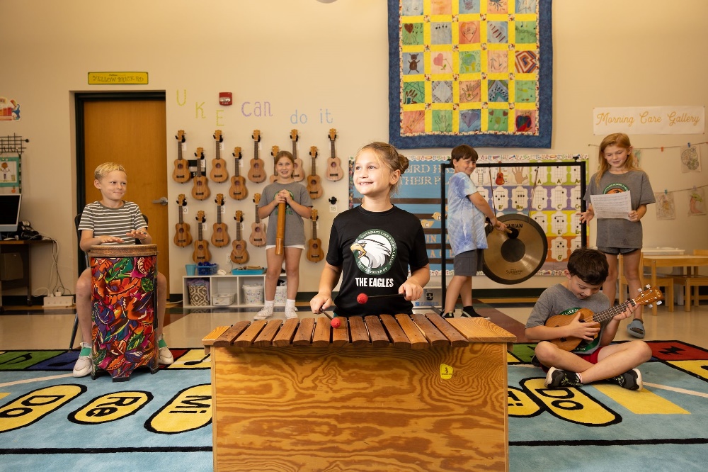 At ULS, every child from age 2 through 4th grade participates in music class as a regular part of their education. Through singing, movement, and playful exploration of instruments, students build a strong musical foundation while developing rhythm, melody, and early music literacy. As students progress, they strengthen their understanding of rhythm and melody by singing and playing a wide range of instruments — from xylophones and maracas to hand chimes and ukuleles — building the skills needed to read and understand music notation.